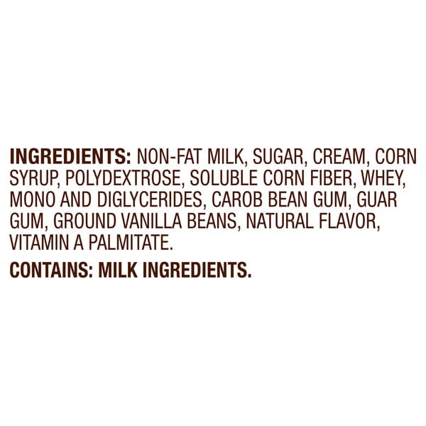 Non-fat Milk, Cane Sugar, Cream, Buttermilk, Tapioca Starch, Pectin, Guar Gum, Natural Flavor, Ground Vanilla Beans.