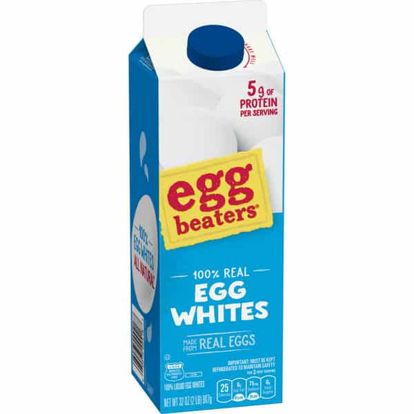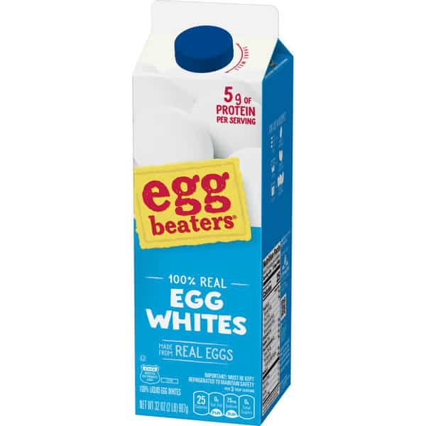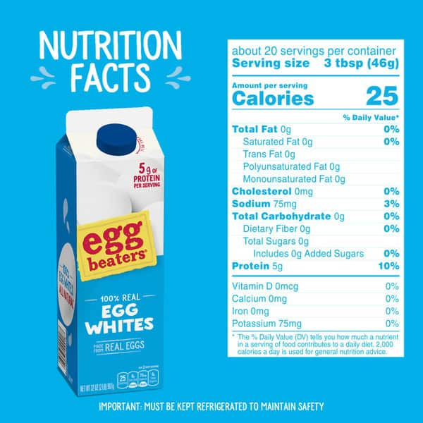 Start your morning strong with a 32-ounce carton of EGG BEATERS All-Natural* 100% Egg Whites. Made with no artificial ingredients, Egg Beaters 100% Egg Whites provide a good source of protein with no cholesterol or fat and half the calories† of a shell egg. The convenient carton makes it easy to pour and measure eggs for any recipe and holds the equivalent of 10 egg whites. So quickly whip up an omelet or frittata for breakfast or use them in your favorite banana bread recipe. Eggs aren’t bad for you, but when you want to cut back on cholesterol, calories or fat, make a simple swap with EGG BEATERS All-Natural 100% Egg Whites.