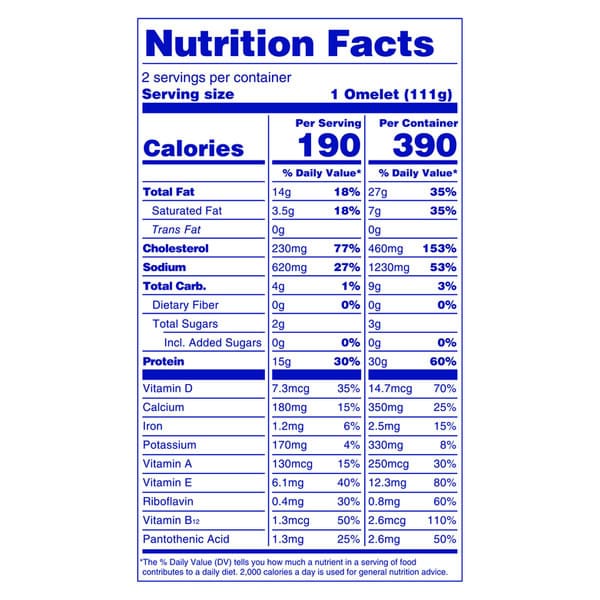 Creative ways to enjoy all of our omelet flavors! Wrap in a warm tortilla for a delicious, on-the-go meal. Cut in half and place between your favorite bread for a savory sandwich. Top with your favorite condiments like salsa, guacamole, or hollandaise sauce. Serve with a green salad for a nutritious lunch or dinner.
