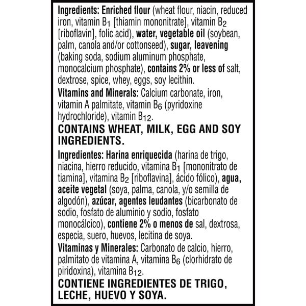 Enriched Flour (wheat Flour, Niacin, Reduced Iron, Vitamin B1 [thiamin Mononitrate], Vitamin B2 [riboflavin], Folic Acid), Water, Vegetable Oil (soybean, Palm, Canola And/or Cottonseed), Sugar, Leavening (baking Soda, Sodium Aluminum Phosphate, Monocalcium Phosphate), Contains 2% Or Less Of Salt, Dextrose, Spice, Whey, Eggs, Soy Lecithin. Vitamins And Minerals: Calcium Carbonate, Iron, Vitamin A Palmitate, Vitamin B6 (pyridoxine Hydrochloride), Vitamin B12.