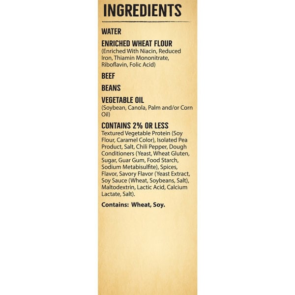 Water Enriched Wheat Flour (enriched With Niacin, Reduced Iron, Thiamin Mononitrate, Riboflavin, Folic Acid) Beef Beans Vegetable Oil (soybean, Canola, Palm And/or Corn Oil) Contains 2% Or Less Textured Vegetable Protein (soy Flour, Caramel Color), Isolated Pea Product, Salt, Chili Pepper, Dough Conditioners (yeast, Wheat Gluten, Sugar, Guar Gum, Food Starch, Sodium Metabisulfite), Spices, Flavor, Savory Flavor (yeast Extract, Soy Sauce (wheat, Soybeans, Salt), Maltodextrin, Lactic Acid, Calcium Lactate, Salt).