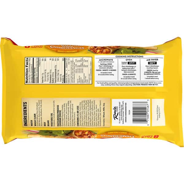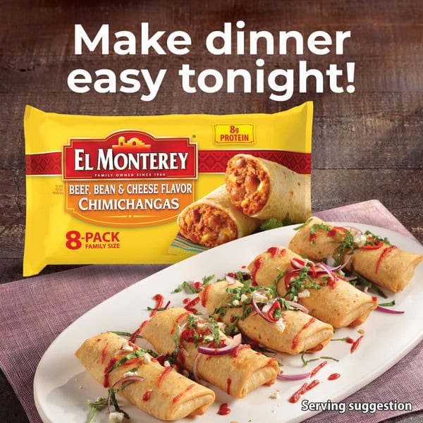 When you serve up El Monterey Beef, Bean & Cheese Flavor Chimichangas, your family will walk away satisfied and full! Freezer-to-microwave meals ready in minutes, these delicious chimichangas include flavorful frozen ground beef, savory beans, real cheddar cheese and authentic Mexican spices wrapped in a fresh-baked flour tortilla. Stock up on these quick, frozen snack options! Whether you need a filling bite for lunch, an easy dinner or quick family meal ideas, trust El Monterey chimichanga frozen burritos to satisfy your craving for authentic Mexican flavors and spices. These El Monterey microwavable chimichangas deliver eight grams of protein to keep you satisfied to power through the day. Enjoy authentic El Monterey Beef, Bean & Cheese Flavor Chimichangas at home or on the go! Bite into crispy, oven-baked goodness in less than 30 minutes or heat quickly in the microwave. Check out our full lineup of quick, frozen meals and freezer burritos. You’re sure to love our steak and cheese frozen burrito and our line of microwave frozen breakfast burrito combos.