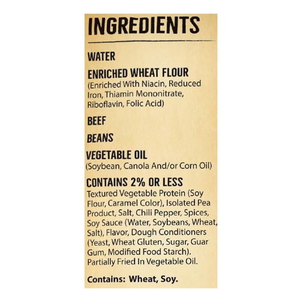 Water Enriched Wheat Flour (enriched With Niacin, Reduced Iron, Thiamin Mononitrate, Riboflavin, Folic Acid) Beef Vegetable Oil (soybean, Canola, Palm And/or Corn Oil) Beans Contains 2% Or Less Textured Vegetable Protein (soy Flour, Caramel Color), Isolated Pea Product, Salt, Chili Pepper, Dough Conditioners (yeast, Wheat Gluten, Sugar, Guar Gum, Food Starch, Sodium Metabisulfite), Spices, Flavor, Savory Flavor (yeast Extract, Soy Sauce (wheat, Soybeans, Salt), Maltodextrin, Lactic Acid, Calcium Lactate, Salt).