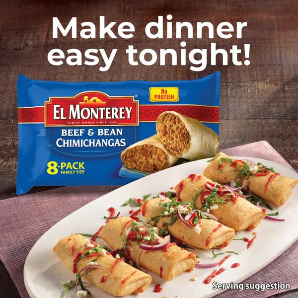We’ve got that big chimi energy… and you will too when you sink your teeth into El Monterey Beef & Bean Chimichangas. Our frozen chimichangas are lightly-fried to give the tortilla a crispy bite. Just grab the blue package for Beef & Bean Chimis or try a few different colors from the rainbow of flavors in the frozen Mexican food section. El Monterey Beef & Bean Chimichangas are great with a side of salsa, hot sauce, guacamole, or sour cream. They’re even better alongside your favorite veggies or side dish. Drop them in your air fryer to level up the crispiness or serve them up fast from your microwave or traditional oven. Big chimi energy? We’ve got that and more, including El Monterey breakfast burritos, crispy taquitos, enchilada meals, and frozen dinners. Now that’s a fiesta!