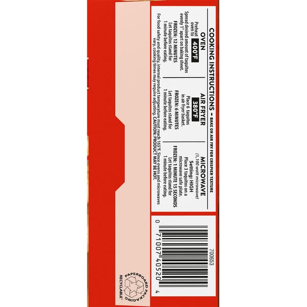 Cooking Instructions – Bake or Air fry for crispier texture. Oven: Preheat oven to 400 degrees F. Spread desired amount of taquitos evenly 1 inch apart on baking sheet. Frozen: 12 Minutes. Let taquitos stand for 1 minute before eating. Air Fryer: 380 degrees F. Place 6 taquitos in air fryer basket. Frozen: 6 Minutes. Let taquitos stand for 1 minute before eating. Microwave Microwave (1,100 watt microwave): Setting: High. Place 3 taquitos on a microwave safe plate. Frozen: 1 Minute 15 Seconds. Let taquitos stand for 1 minute before eating. For food safety and quality, internal product temperature must reach 165 degrees F. Since ovens and microwaves vary, cooking times may require adjusting. Caution: product may be hot.