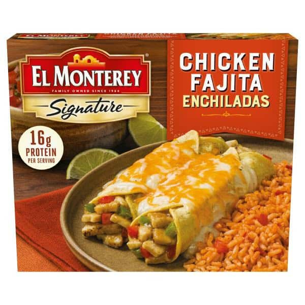 Chicken Fajita Enchiladas (Tortilla [Water, Corn Flour Treated with Hydrated Lime, Enriched Wheat Flour {Enriched with Niacin, Reduced Iron, Thiamin Mononitrate, Riboflavin, Folic Acid}, Wheat Gluten, Vegetable Oil {Soybean, Canola and/or Corn Oil}, Salt, Turmeric, Dough Conditioners {Yeast, Sugar, Guar Gum, Modified Food Starch}], Water, Charbroiled Chicken [Chicken Thigh Meat, Chicken White Meat, Water, Corn Oil, Salt, Modified Food Starch, Sodium Phosphate], Bell Pepper, Onion, Tomato Paste [Tomatoes], Modified Corn Starch, Enriched Wheat Flour [Enriched with Niacin, Reduced Iron, Thiamin Mononitrate, Riboflavin, Folic Acid], Spices, Distilled Vinegar, Vegetable Oil [Soybean, Canola and/or Corn Oil], Crushed Garlic with Citric Acid, Chicken Broth Flavor [Chicken Broth, Flavor, Salt], Salt, Granulated Onion, Guar Gum, Monterey Jack Cheese [Pasteurized Milk, Cheese Cultures, Salt, Enzymes]), Cooked Rice (Water, Rice), Water Sour Cream (Cultured Milk, Cream, Whey, Less than 2% of Food Starch-Modified Corn, Sodium Phosphate, Guar Gum, Carrageenan, Calcium Sulfate, Locust Bean Gum, Potassium Sorbate), Ground Tomatoes in Puree (Tomatoes, Citric Acid), Cheddar Cheese (Pasteurized Cultured Milk, Salt, Enzymes, Annatto [Vegetable Color]), Monterey Jack Cheese (Pasteurized Milk, Cheese Cultures, Salt, Enzymes), Canola Oil Whole Milk (Vitamin D3 Added), Contains Less than 2% Green Chiles (Green Chile Peppers, Less than 2% of: Calcium Chloride, Salt, Citric Acid), Cream, Corn Starch, Onion, Garlic (Garlic, Water), Chicken Stock Concentrate (Chicken Stock, Natural Flavors [Contains Chicken Meat], Salt, Chicken Fat, Modified Corn Starch [Processing Aid], Garlic Powder, Spices, Vegetable Stock [Carrot, Celery, Onion, Leek, Red Bell Pepper, Tomato, Parsley, Garlic]), Jalapeno (Jalapeno, Salt, Acetic Acid, Calcium Chloride), Guajillo Chili Pepper Base (Water, Guajillo Chili, Onion Puree, Sea Salt, Cane Sugar, Spices [Mustard], Cilantro, Garlic Puree, Sesame Seeds, Paprika, Corn Starch, Citric Acid), Chicken Base (Cooked Mechanically Separated Chicken, Salt, Chicken Flavor, Maltodextrin, Chicken Fat, Sugar, Whey Powder [Milk], Onion Powder, Extractives of Turmeric [Color], Natural Flavor), Cilantro, Salt, Paprika [Color], Spices.