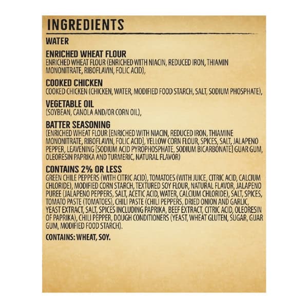 Water Enriched Wheat Flour Enriched Wheat Flour (enriched With Niacin, Reduced Iron, Thiamin Mononitrate, Riboflavin, Folic Acid), Cooked Chicken Cooked Chicken (chicken, Water, Modified Food Starch, Salt, Sodium Phosphate), Vegetable Oil (soybean, Canola And/or Corn Oil), Batter Seasoning (enriched Wheat Flour (enriched With Niacin, Reduced Iron, Thiamine Mononitrate, Riboflavin, Folic Acid), Yellow Corn Flour, Spices, Salt, Jalapeno Pepper, Leavening (sodium Acid Pyrophosphate, Sodium Bicarbonate) Guargum, Oleoresin Paprika And Turmeric, Natural Flavor) Contains 2% Or Less Green Chile Peppers (with Citric Acid), Tomatoes (with Juice, Citric Acid, Calcium Chloride), Modified Corn Starch, Textured Soy Flour, Natural Flavor, Jalapeno Puree (jalapeno Peppers, Salt, Acetic Acid, Water, Calcium Chloride), Salt , Spices, Tomato Paste (tomatoes), Chili Paste (chili Peppers, Dried Onion And Garlic, Yeast Extract, Salt, Spices Including Paprika, Beef Extract, Citric Acid, Oleoresin Of Paprika), Chili Pepper, Dough Conditioners (yeast, Wheat Gluten, Sugar, Guar Gum, Modified Food Starch).