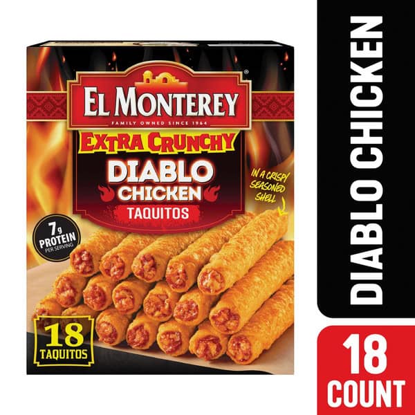Muy caliente! With real chicken and devilish spices wrapped in a fun and festive crispy seasoned shell, El Monterey Extra Crunchy Diablo Chicken Taquitos really turn up the heat during family time and social gatherings. Our frozen taquitos make an exciting after-school snack for adventurous kids or a crowd-pleasing appetizer for game days, movie nights, holiday parties, and more. El Monterey Extra Crunchy Diablo Chicken Taquitos taste great out of the microwave or traditional oven. Or drop them in your air fryer to really heighten the crispiness. Just don’t forget the guacamole, sour cream, or ranch. You’re gonna want to cool things down with a nice dip. Our crispy taquitos are only the beginning. El Monterey burritos and chimichangas, breakfast burritos, enchilada meals, and other frozen Mexican snacks round out our devilishly tasty lineup!