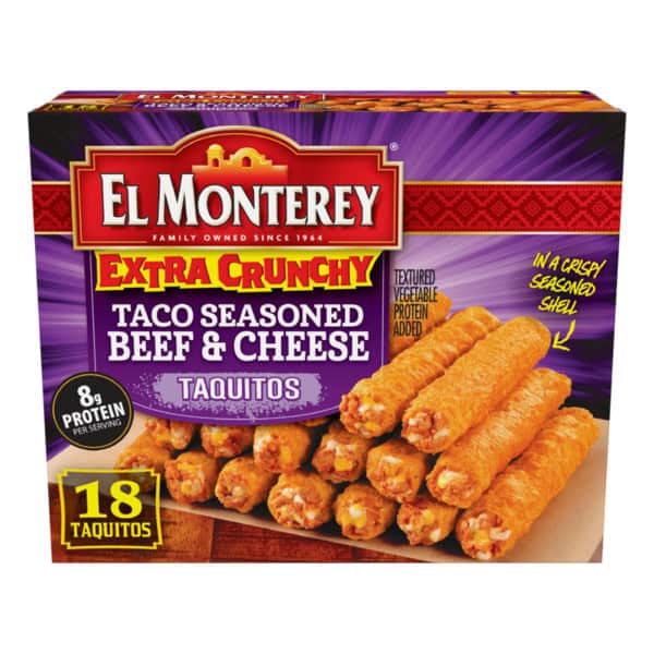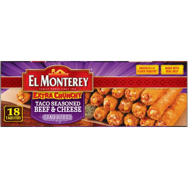 Satisfy your cravings for a crunchy, bold and protein-packed appetizer or snack with our El Monterey Extra Crunchy Taco Seasoned Beef & Cheese Taquitos. Crunch into taco-seasoned beef, two melted cheeses, jalapenos peppers, and green chilies in a crispy seasoned shell. These delicious El Monterey taquitos are frozen for your convenience and take only a few minutes to prepare in the microwave that are perfect nights in by the fireplace. For ultimate flavor and crunch, use the oven or air fryer. Perfect for dipping in guacamole, ranch dressing, salsa, or entirely on their own! Whether you have to feed the whole family or just need a quick snack or lunch for the kids, El Monterey taquitos are perfect for every occasion. Stay warm this winter and stock your freezer with El Monterey Extra Crunchy Taco Seasoned Beef & Cheese Taquitos for a satisfying and delicious meal anytime, anywhere! You can find El Monterey Extra Crunchy Taco Seasoned Beef & Cheese Taquitos in the frozen Mexican snack or frozen meals section!