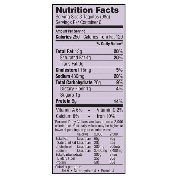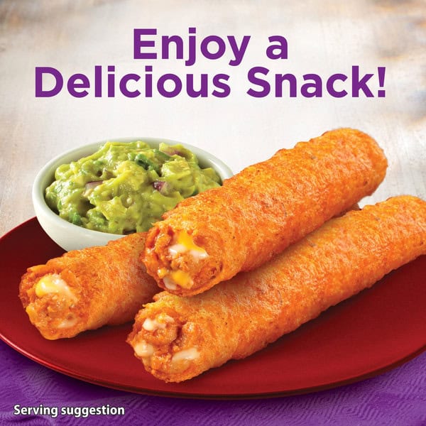 Cooking Instructions: Bake or air fry for crispier texture. Oven: Preheat oven to 400 degrees F. Spread desired amount of taquitos evenly 1 inch apart on baking sheet. Frozen: 12 minutes. Let taquitos stand for 1 minute before eating. Air Fryer (350 degrees F): Place 4 taquitos in air fryer basket. Place basket into air fryer. Frozen: 6 minutes. Let taquitos stand for 1 minute before eating. Microwave: (1,100 watt microwave). Setting: High. Place 3 taquitos on a microwave safe plate. Frozen: 50 seconds. Let taquitos stand for 1 minute before eating. For food safety and quality, internal product temperature must reach 165 degrees F. Since ovens and microwaves vary, cooking times may require adjusting. Caution: Product may be hot.