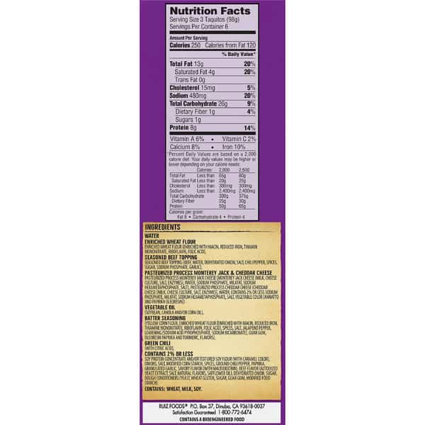 Water Enriched Wheat Flour Enriched Wheat Flour (enriched With Niacin, Reduced Iron, Thiamin Mononitrate, Riboflavin, Folic Acid), Seasoned Beef Topping Seasoned Beef Topping (beef, Water, Dehydrated Onion, Salt, Chili Pepper, Spices, Sugar, Sodium Phosphate, Garlic), Pasteurized Process Monterey Jack & Cheddar Cheese Pasteurized Process Monterey Jack Cheese (monterey Jack Cheese (milk, Cheese Culture, Salt, Enzymes), Water, Sodium Phosphate, Milkfat, Sodium Hexametaphosphate, Salt), Pasteurized Process Cheddar Cheese (cheddar Cheese (milk, Cheese Culture, Salt, Enzymes), Water, Contains 2% Or Less Sodium Phosphate, Milkfat, Sodium Hexametaphosphate, Salt, Vegetable Color (annatto And Paprika Oleoresin]) Vegetable Oil (soybean, Canola And/or Corn Oil), Batter Seasoning (yellow Corn Flour, Enriched Wheat Flour (enriched With Niacin, Reduced Iron, Thiamine Mononitrate, Riboflavin, Folic Acid), Spices, Salt, Jalapeno Pepper, Leavening (sodium Acid Pyrophosphate, Sodium Bicarbonate), Guargum, Oleoresin Paprika And Turmeric, Flavors), Green Chili (with Citric Acid), Contains 2% Or Less Soy Protein Concentrate And/or Textured Soy Flour (with Caramel Color), Onions, Salt, Modified Corn Starch, Spices, Ground Chili Pepper, Paprika, Granulated Garlic, Savory Flavor (with Maltodextrin), Beef Flavor (autolyzed Yeast Extract, Salt, Natural Flavors, Safflower Oil), Dehydrated Onion, Sugar, Dough Conditioners (yeast, Wheat Gluten, Sugar, Guargum, Modified Food Starch).