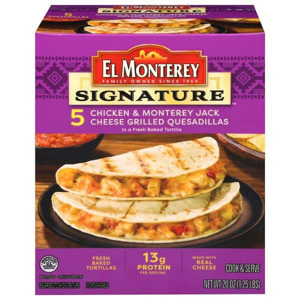 13 g protein per serving. 5 individually wrapped. Chicken & monterey jack cheese in a fresh baked tortilla. Family owned since 1964. I promise to bring you the best Mexican food always. – Fred Ruiz – founder. Family owned since 1964. 100% real cheese. Fresh baked tortilla. You can taste the quality. Charbroiled chicken. Monterey jack cheese. Authentic spices. Fresh baked flour tortillas. Satisfaction guaranteed. Inspected for wholesomeness by US Department of Agriculture. elmonterey.com. Facebook: facebook.com/elmonterey. Visit us at elmonterey.com. Certified 100% recycled paperboard.