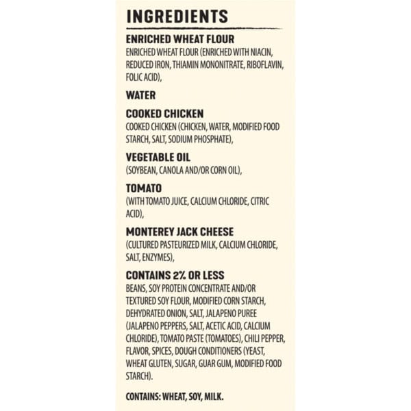Enriched Wheat Flour Enriched Wheat Flour (enriched With Niacin, Reduced Iron, Thiamin Mononitrate, Riboflavin, Folic Acid), Water Cooked Chicken Cooked Chicken (chicken, Water, Modified Food Starch, Salt, Sodium Phosphate), Vegetable Oil (soybean, Canola And/or Corn Oil), Tomato (with Tomato Juice, Calcium Chloride, Citric Acid), Monterey Jack Cheese (cultured Pasteurized Milk, Calcium Chloride, Salt, Enzymes), Contains 2% Or Less Beans, Soy Protein Concentrate And/or Textured Soy Flour, Modified Corn Starch, Dehydrated Onion, Salt, Jalapeno Puree (jalapeno Peppers, Salt, Acetic Acid, Calcium Chloride), Tomato Paste (tomatoes), Chili Pepper, Flavor, Spices, Dough Conditioners (yeast, Wheat Gluten, Sugar, Guargum, Modified Food Starch).