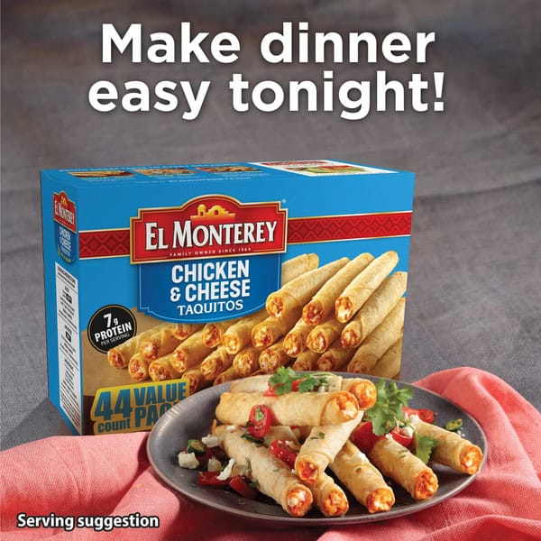 Get ready for a frickin’ fiesta in your freezer! El Monterey Chicken & Cheese Taquitos are a dippable and delicious Mexican snack for family dinners, game days, movie nights, holiday parties, and more. These crowd-pleasing and host-friendly frozen taquitos heat up fast in the microwave or traditional oven but a few minutes in the air fryer really levels up the crispiness. Plus, with our new recipe, they’re now packed with more cheese! Did we mention that kids love them? El Monterey Chicken & Cheese Taquitos make a convenient after-school snack – especially served with a side of salsa, guacamole, sour cream, or ranch. Of course, the party is just getting started when the crispy taquitos hit the table. El Monterey burritos and chimichangas, breakfast burritos, enchilada meals, and other frozen appetizers turn any social gathering into a frickin’ fiesta.