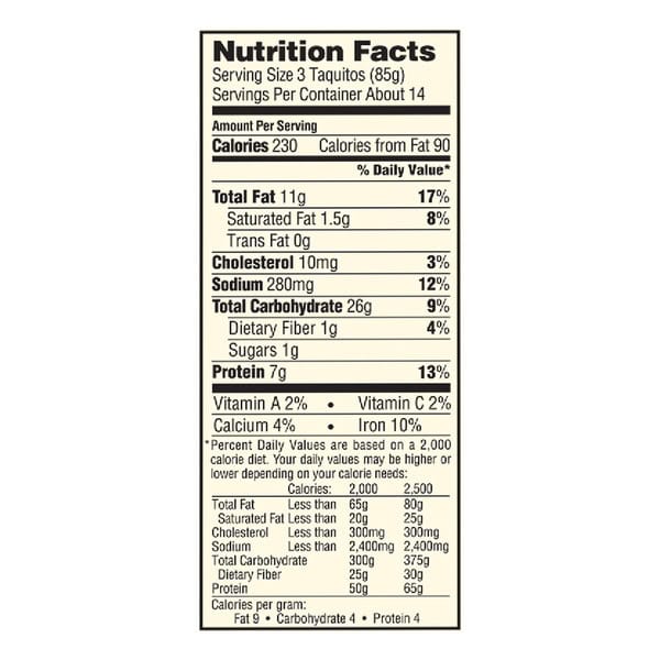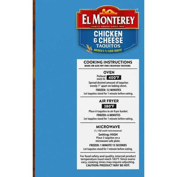 Cooking Instructions: Bake or air fry for crispier texture. Oven: Preheat oven to 400 degrees F. Spread desired amount of taquitos evenly 1 inch apart on baking sheet. Frozen: 12 minutes. Let taquitos stand for 1 minute before eating. Air Fryer (380 degrees F): Place 6 taquitos in air fryer basket. Frozen: 6 minutes. Let taquitos stand for 1 minute before eating. Microwave: (1,100 watt microwave). Setting: High. Place 3 taquitos ona microwave safe plate. Frozen: 1 minute 15 seconds. Let taquitos stand for 1 minute before eating. For food safety and quality, internal product temperature must reach 165 degrees F. Sine ovens vary, cooking times may require adjusting. Caution: Product may be hot.