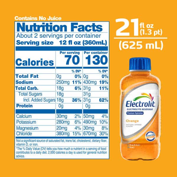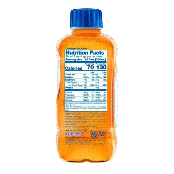 Water, Dextrose Monohydrate, Contains 2% Or Less Of: Sodium Lactate, Natural Orange Flavor, Citric Acid, Potassium Chloride, Molasses, Magnesium Chloride, Calcium Chloride, Salt, Steviol Glycosides, Fd&c Yellow No. 6