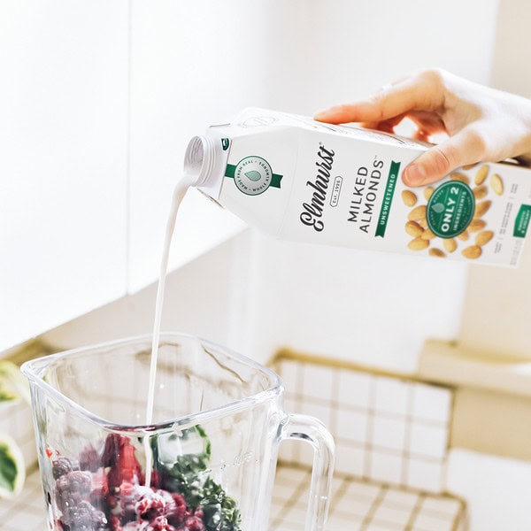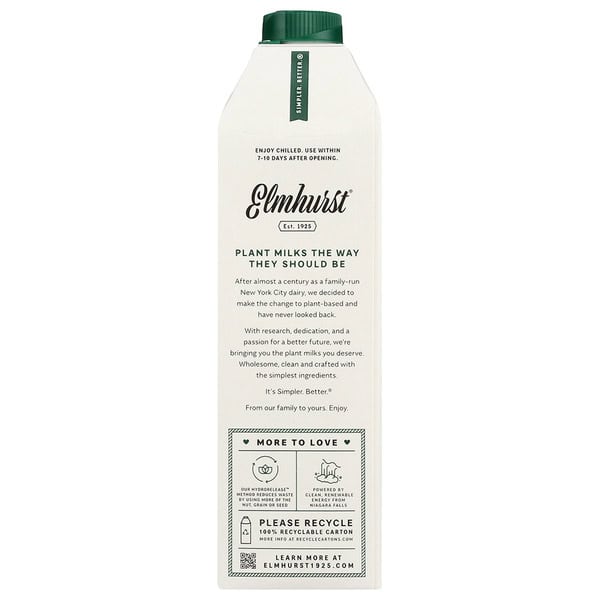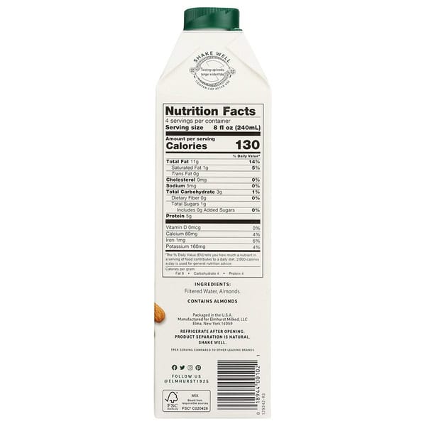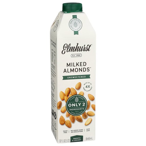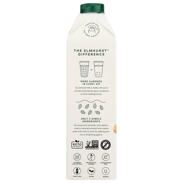 Made with just 2 simple ingredients: almonds and water. Forget added gums or fillers– up to 4x more almonds in every carton make Elmhurst’s Unsweetened Almond Milk deliciously creamy. Enjoy a glass or add to smoothies, shakes, cereal and recipes.