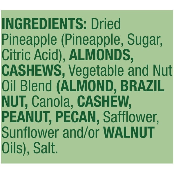 Dried Pineapple (pineapple, Sugar, Citric Acid), Almonds, Cashews, Vegetable And Nut Oil Blend (almond, Brazil Nut, Canola, Cashew, Peanut, Pecan, Safflower, Sunflower And/or Walnut Oils), Salt