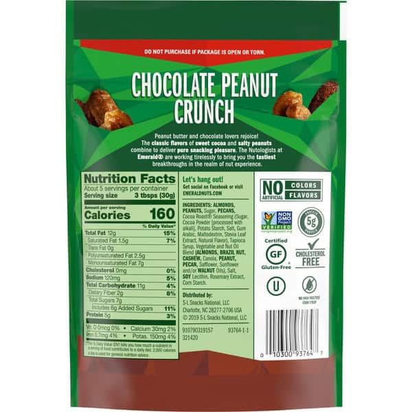 We roast our select almonds in real cocoa, then add honey-roasted peanuts and glazed pecans for a sweet and salty punch sure to delight- and maybe even surprise- your mouth. They are a delicious, salty sweet snack. Unique and tasty seasoned nuts in an on-the-go size are great for snacking anytime, anywhere! Emerald harvests only the tastiest, crunchiest, high quality nuts. Our secret is in our unique seasoning and distinct crunch that each nut provides. Whatever the occasion, Emerald has the specific nut you are looking for.,