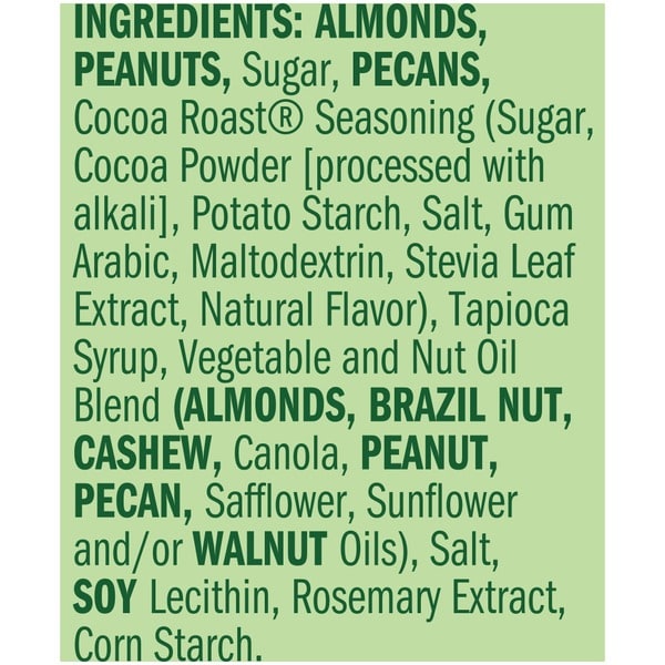 Almonds, Peanuts, Sugar, Pecans, Cocoa Roast® Seasoning (sugar, Cocoa Powder [processed With Alkali], Potato Starch, Salt, Gum Arabic, Maltodextrin, Stevia Leaf Extract, Natural Flavor), Tapioca Syrup, Vegetable And Nut Oil Blend (almonds, Brazil Nut, Cashew, Canola, Peanut, Pecan, Safflower, Sunflower And/or Walnut Oils), Salt, Soy Lecithin, Rosemary Extract, Corn Starch