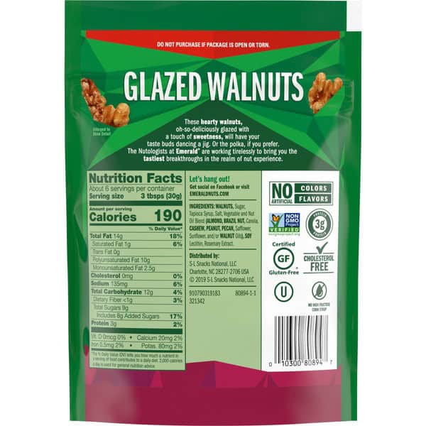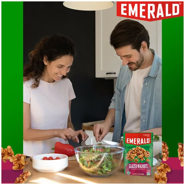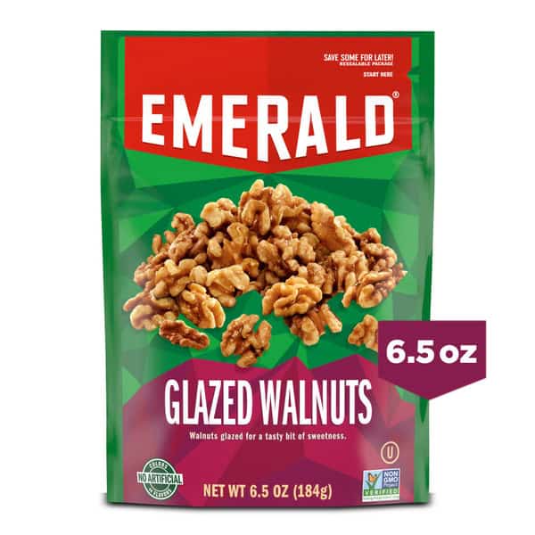 Emerald Glazed Walnuts explode with irresistible flavor, glazed with a bit of sweetness to bring out both salty and sweet flavors. They’re a pure pleasure for your taste buds. Not only do they make a satisfying treat on their own, they’re also delicious in your favorite recipes to add flavor and crunch. And because you don’t always have time to stop for a satisfying snack, these nuts come in a resealable bag, so they stay fresh and are easy to snack on now and save some for later. Emerald harvests only the tastiest, crunchiest, high-quality nuts. These are plant-powered and poppable nuts. Our Kosher nuts are Non-GMO Project Verified, Certified Gluten-Free, and contain no artificial colors or flavors. Our unique seasoning and the distinct crunch of each nut makes them perfect for your salad, charcuterie board or for a truly satisfying snack, right out of the bag. So, whether you want a great-tasting snack or a treat you’re proud to serve to your guests, you can count on the delicately flavored and thoughtfully crafted recipe of Emerald Nuts.,