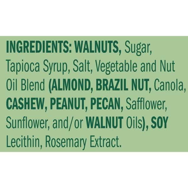 Walnuts, Sugar, Tapioca Syrup, Salt, Vegetable And Nut Oil Blend (almond, Brazil Nut, Canola, Cashew, Peanut, Pecan, Safflower, Sunflower, And/or Walnut Oils), Soy Lecithin, Rosemary Extract