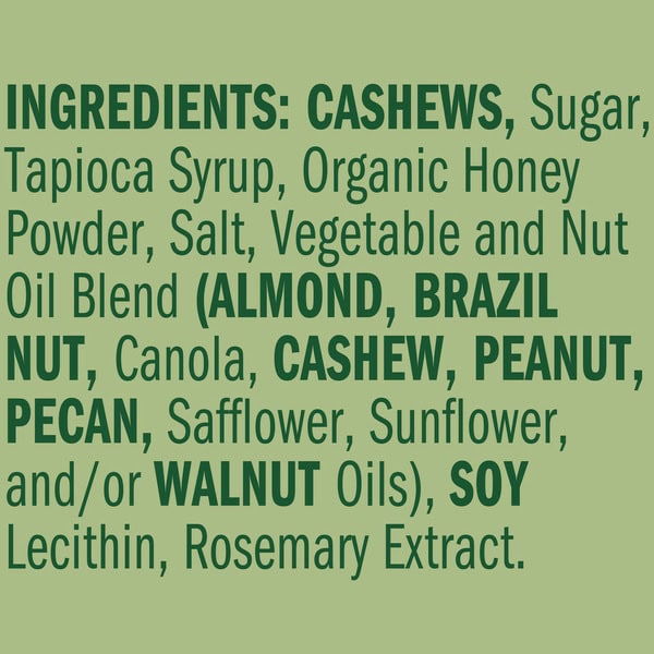 Cashews, Sugar, Tapioca Syrup, Organic Honey Powder, Salt, Vegetable And Nut Oil Blend (almond, Brazil Nut, Canola, Cashew, Peanut, Pecan, Safflower, Sunflower, And/or Walnut Oils), Soy Lecithin, Rosemary Extract