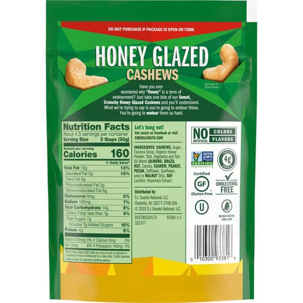 “Honey” is a term of endearment for a reason – it’s that good. Emerald Honey Glazed Cashews are glazed with a bit of sweetness from organic honey that pairs with their already delicious flavor. Not only do they make a satisfying treat on their own, but they’re also delicious in your favorite recipes to add flavor and crunch. And because you don’t always have time to stop for a satisfying snack, these nuts come in a resealable bag, so they stay fresh and are easy to snack on now and save some for later. Emerald harvests only the tastiest, crunchiest, high-quality nuts. These are plant-powered and poppable nuts. Our Kosher nuts are Non-GMO Project Verified, Certified Gluten-Free, and contain no artificial colors or flavors. Our unique seasoning and the distinct crunch of each nut makes them perfect for your salad, charcuterie board or for a truly satisfying snack, right out of the bag. So, whether you want a great-tasting snack or a treat you’re proud to serve to your guests, you can count on the delicately flavored and thoughtfully crafted recipe of Emerald Nuts.,