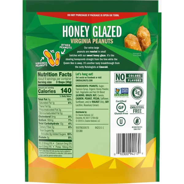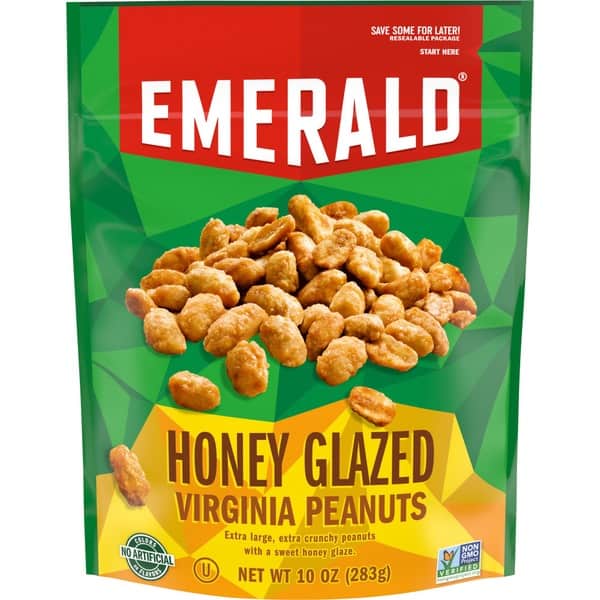 Our extra-large peanuts are roasted in small batches with our sweet honey glaze. These nuts come in a resealable bag so they stay fresh for later and are easy to take on the go. Emerald harvests only the tastiest, crunchiest, high quality nuts. Our secret is in our unique seasoning and distinct crunch that each nut provides. Whatever the occasion, Emerald has the specific nut you are looking for.,
