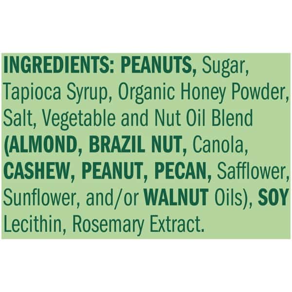 Peanuts, Sugar, Tapioca Syrup, Organic Honey Powder, Salt, Vegetable And Nut Oil Blend (almond, Brazil Nut, Canola, Cashew, Peanut, Pecan, Safflower, Sunflower, And/or Walnut Oils), Soy Lecithin, Rosemary Extract