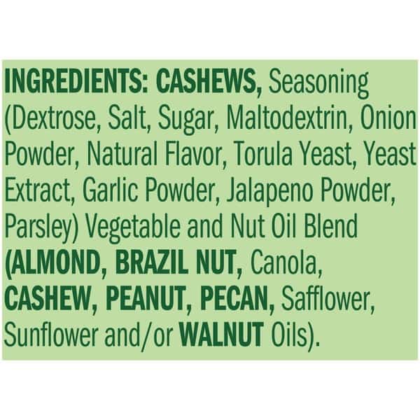 Cashews, Seasoning (dextrose, Salt, Sugar, Maltodextrin, Onion Powder, Natural Flavor, Torula Yeast, Yeast Extract, Garlic Powder, Jalapeno Powder, Parsley) Vegetable And Nut Oil Blend (almond, Brazil Nut, Canola, Cashew, Peanut, Pecan, Safflower, Sunflower And/or Walnut Oils)