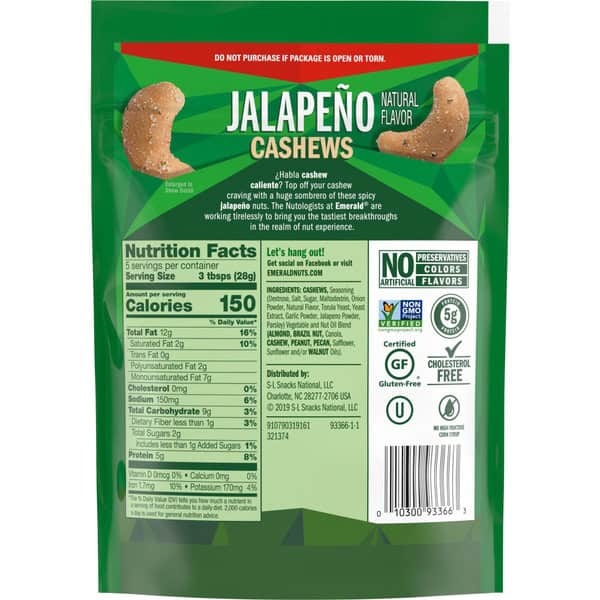 Emerald® Cashews are a tasty, crunchy snack. With 5g protein per serving, they’re a better for you snacking option. These jalapeno cashews are boldly seasoned for a spicy flavor and they come in a convenient resealable bag to keep them fresh longer. They’re Non-GMO Project Verified, and contain no artificial preservatives, colors, or flavors. These convenient resealable bags are perfect for a better-for-you snack anytime. Emerald® harvests only the tastiest, crunchiest, high-quality nuts. Our unique seasoning and the distinct crunch of each nut makes them perfect for your salad or charcuterie board, or for a truly satisfying snack, right out of the bag. Whether you want a great-tasting snack or a treat you’re proud to serve to your guests, you can count on the delicately flavored and thoughtfully crafted recipe of Emerald® Nuts. Whatever the occasion, Emerald® has the specific nut you are looking for.,