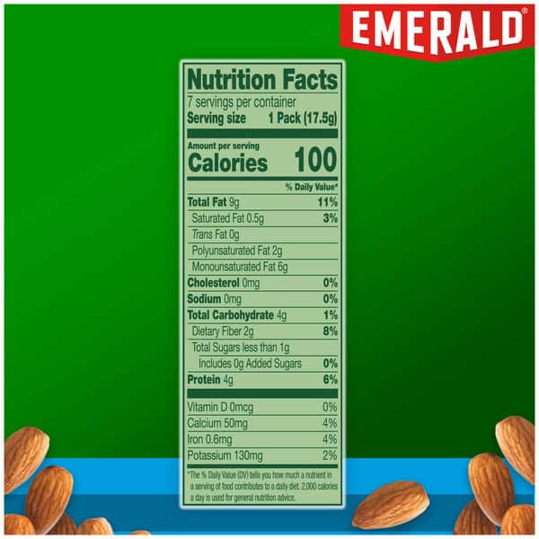 At Emerald, we’re nuts about providing you with high-quality and delicious nuts. Almonds are a satisfying go-to snack to keep hunger away. These nuts are packed just as they are, with no salt added. And because you don’t always have time to stop for a satisfying snack, our 100-calorie packs are great for your on-the-go lifestyle. Emerald harvests only the tastiest, crunchiest, high-quality nuts. Our secret is in our distinct crunch that each nut provides. Whatever the occasion, Emerald has the specific nut you are looking for. With no artificial preservatives, colors, or flavors, no gluten, and no GMOs, it’s a snack you’ll feel good about! And each 100-calorie pack has 4g of protein to help fuel your active day. So when you want a better-for-you snack to satisfy your craving, you can count on Emerald Nuts.,