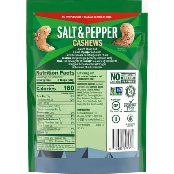 At Emerald, we’re nuts about providing you with high-quality and delicious nuts. A pinch of salt and a dash of pepper combined with the smooth, satisfying crunch of our cashews and you’ve got perfectly seasoned nutty bliss. With no artificial colors or flavors, they are the perfect for your salad, charcuterie board or snack, right out of the bag for health-conscious people. Unique and tasty seasoned cashews in a resealable size are great for snacking anytime! Emerald harvests only the tastiest, crunchiest, high quality nuts. Our unique seasoning and the distinct crunch of each nut makes for a truly satisfying snack. Whether you want a great-tasting snack or a treat you’re proud to serve to your guests, you can count on the delicately flavored and thoughtfully crafted recipe of Emerald Nuts. Whatever the occasion, Emerald has the specific nut you are looking for.,