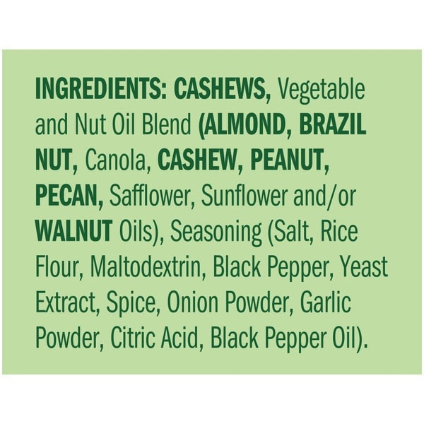 Cashews, Vegetable And Nut Oil Blend (almond, Brazil Nut, Canola, Cashew, Peanut, Pecan, Safflower, Sunflower And/or Walnut Oils), Seasoning (salt, Rice Flour, Maltodextrin, Black Pepper, Yeast Extract, Spice, Onion Powder, Garlic Powder, Citric Acid, Black Pepper Oil)