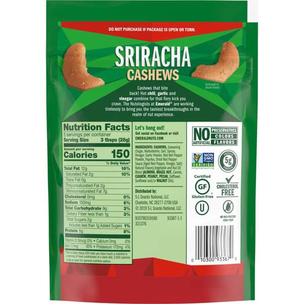 Cashews that bite back! Hot pepper sauce, garlic and paprika combine for that fiery kick you crave. These nuts come in a resealable bag so they stay fresh for later and are easy to take on the go. Emerald harvests only the tastiest, crunchiest, high quality nuts. Our secret is in our unique seasoning and distinct crunch that each nut provides. Whatever the occasion, Emerald has the specific nut you are looking for.,