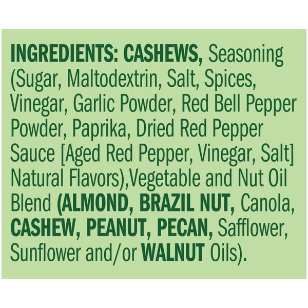 Cashews, Seasoning (sugar, Maltodextrin, Salt, Spices, Vinegar, Garlic Powder, Red Bell Pepper Powder, Paprika, Dried Red Pepper Sauce [aged Red Pepper, Vinegar, Salt] Natural Flavors), Vegetable And Nut Oil Blend (almond, Brazil Nut, Canola, Cashew, Peanut, Pecan, Safflower, Sunflower And/or Walnut Oils)