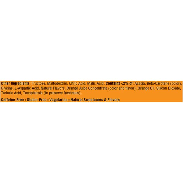 Fructose, Maltodextrin, Citric Acid, Malic Acid. Contains <2% Of: Acacia, Beta-carotene (color), Dried Orange Juice Concentrate (color And Flavor), Glycine, L-aspartic Acid, Natural Flavors, Orange Oil, Silicon Dioxide, Tartaric Acid, Tocopherols (to Preserve Freshness).