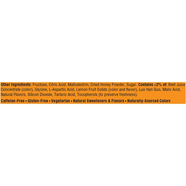 Fructose, Citric Acid, Maltodextrin, Dried Honey Powder, Sugar. Contains <2% Of: Beet Juice Concentrate (color), Glycine, L-aspartic Acid, Lemon Fruit Solids (color And Flavor), Luo Han Guo Fruit Extract, Malic Acid, Natural Flavors, Silicon Dioxide, Tartaric Acid, Tocopherols (to Preserve Freshness).