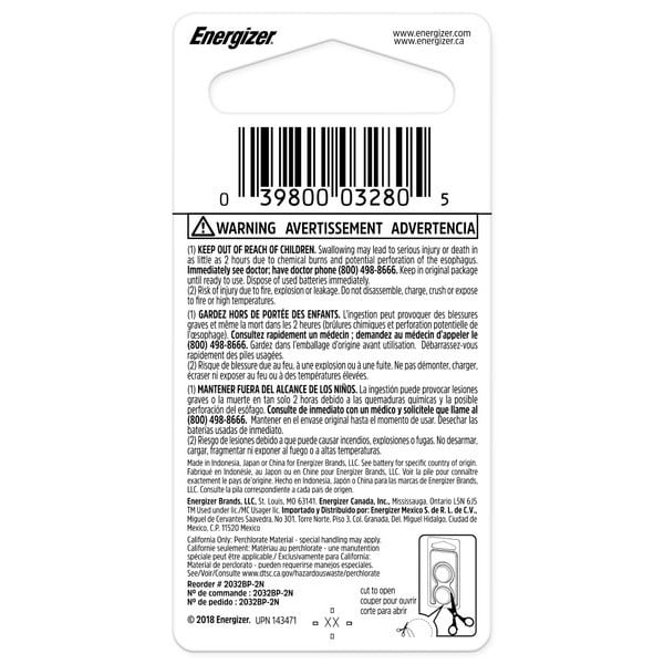 Energizer 2032 Lithium Coin Batteries provide reliable, long lasting power for your important devices. These lithium 2032 batteries perform in extreme temperatures ranging from -22 F to 140 F for dependable power, even in the toughest conditions. Reach for these Energizer batteries when you need key fob batteries, batteries for remotes, or glucose monitors and heart monitors. Energizer coin batteries are also an ideal power source for your keyless entry system, toys and games. Lasting up to 10 years in storage, these lithium batteries provide reliable power whenever you need them. Energizer packages its lithium coin batteries in child-resistant packaging, designed to help keep kids safe from ingesting them.