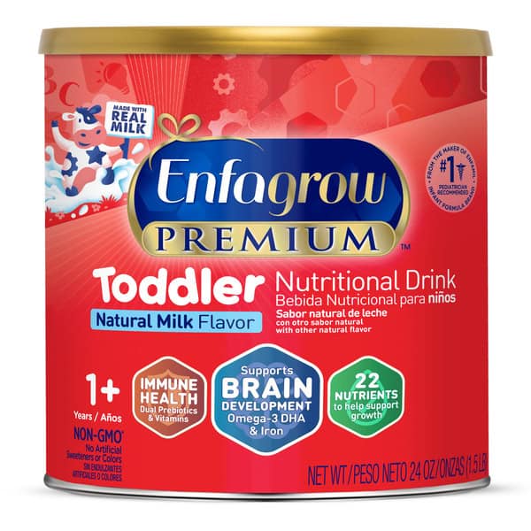 From the maker of Enfamel No. 1 recommended infant formula brand by pediatrician. No artificial preservatives, sweeteners or colors. Formerly toddler next step. Immune health dual prebiotics & vitamins. Supports brain development Omega-3 DHA. 22 nutrients to complement diet. 2 servings per day! (Two Cups (16 fl oz) milk, dairy or milk alternative recommended daily for 1-3 years old. Please speak to your child’s doctor for specific nutrient recommendations). Enfagrow Premium Toddler Nutritional Drink is non-GMO (II) and has no artificial preservatives, sweeteners or colors. 85% of brain growth happens in the first three years. DHA helps support healthy brain development. Toddlers get into everything once they are mobile. Enfagrow has prebiotics, vitamin C and Zinc to support immune health. Enfagrow complements the diet. It has nutrients found in foods toddlers might not get enough of. Also available in convenient, ready-to-use bottles. We are here to help you navigate your journey through toddlerhood. Filled by weight, not by volume; some settling may occur. Makes approx 130 fl oz. This exclusive drink is available only from the Enfagrow brand. Sign up and save! For valuable samples and coupons, visit enfagrow.com/enroll.