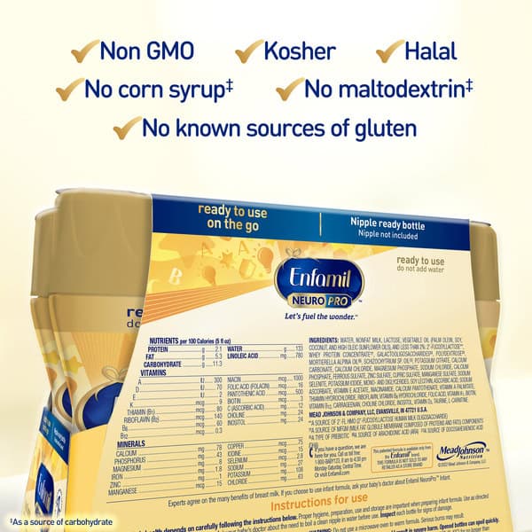 Water, Nonfat Milk, Lactose, Vegetable Oil (palm Olein, Soy, Coconut, And High Oleic Sunflower Oils), And Less Than 2%: Galactooligosaccharides*, Polydextrose*, Mortierella Alpina Oil**, Crypthecodinium Cohnii Oil+, Whey Protein Concentrate, Potassium Citrate, Calcium Carbonate, Calcium Chloride, Magnesium Phosphate, Sodium Chloride, Calcium Phosphate, Ferrous Sulfate, Sodium Citrate, Zinc Sulfate, Cupric Sulfate, Manganese Sulfate, Sodium Selenite, Potassium Iodide, Mono- And Diglycerides, Soy Lecithin, Ascorbic Acid, Sodium Ascorbate, Vitamin E Acetate, Niacinamide, Calcium Pantothenate, Vitamin A Palmitate, Thiamin Hydrochloride, Riboflavin, Vitamin B6 Hydrochloride, Folic Acid, Vitamin K1, Biotin, Vitamin B12, Carrageenan, Choline Chloride, Inositol, Nucleotides (cytidine 5′-monophosphate, Adenosine 5′-monophosphate, Disodium Uridine 5′-monophosphate, Disodium Guanosine 5′-monophosphate), Vitamin D3, Taurine, L-carnitine.