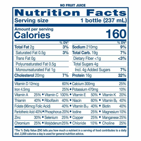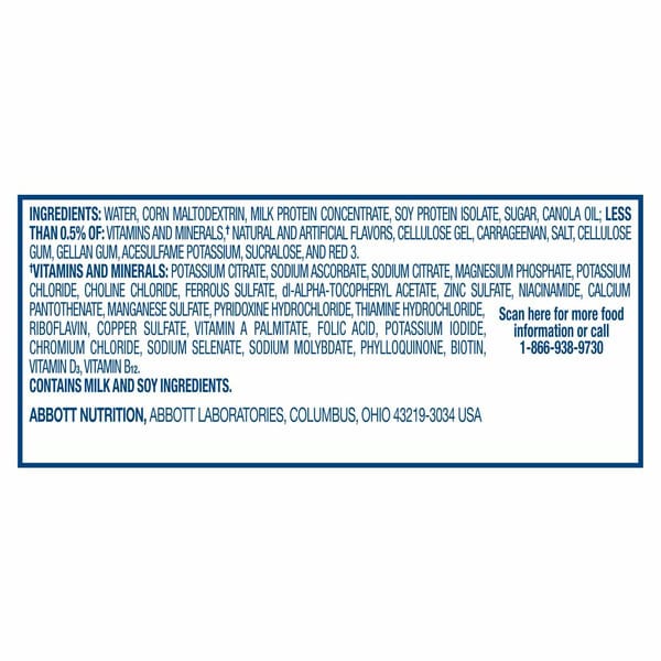 Water, Corn Maltodextrin, Milk Protein Concentrate, Soy Protein Isolate, Sugar, Canola Oil, Less Than 0.5% Of: Vitamins And Minerals†, Natural And Artificial Flavors, Cellulose Gel, Carrageenan, Salt, Cellulose Gum, Gellan Gum, Acesulfame Potassium, Sucralose, And Red 3, †vitamins And Minerals: Potassium Citrate, Sodium Ascorbate, Sodium Citrate, Magnesium Phosphate, Potassium Chloride, Choline Chloride, Ferrous Sulfate, Dl-alpha-tocopheryl Acetate, Zinc Sulfate, Niacinamide, Calcium Pantothenate, Manganese Sulfate, Pyridoxine Hydrochloride, Thiamine Hydrochloride, Riboflavin, Copper Sulfate, Vitamin A Palmitate, Folic Acid, Potassium Iodide, Chromium Chloride, Sodium Selenate, Sodium Molybdate, Phylloquinone, Biotin, Vitamin D₃, Vitamin B₁₂