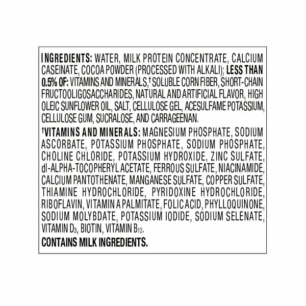 Water, Milk Protein Concentrate, Calcium Caseinate, Cocoa Powder (processed With Alkali), Less Than 0.5% Of: Vitamins And Minerals,† Soluble Corn Fiber, Short-chain Fructooligosaccharides, Natural And Artificial Flavor, High Oleic Sunflower Oil, Salt, Cellulose Gel, Acesulfame Potassium, Cellulose Gum, Sucralose, And Carrageenan, †vitamins And Minerals: Magnesium Phosphate, Sodium Ascorbate, Potassium Phosphate, Sodium Phosphate, Choline Chloride, Potassium Hydroxide, Zinc Sulfate, Dl-alpha-tocopheryl Acetate, Ferrous Sulfate, Niacinamide, Calcium Pantothenate, Manganese Sulfate, Copper Sulfate, Thiamine Hydrochloride, Pyridoxine Hydrochloride, Riboflavin, Vitamin A Palmitate, Folic Acid, Phylloquinone, Sodium Molybdate, Potassium Iodide, Sodium Selenate, Vitamin D₃, Biotin, Vitamin B₁₂
