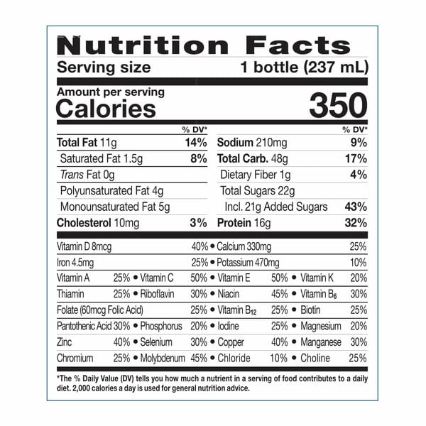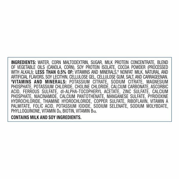 Water, Corn Maltodextrin, Sugar, Milk Protein Concentrate, Blend Of Vegetable Oils (canola, Corn), Soy Protein Isolate, Cocoa Powder (processed With Alkali), Less Than 0.5% Of: Vitamin And Minerals,† Nonfat Milk, Natural And Artificial Flavors, Soy Lecithin, Cellulose Gel, Cellulose Gum, Salt, And Carrageenan, †vitamins And Minerals: Potassium Citrate, Sodium Citrate, Magnesium Phosphate, Potassium Chloride, Choline Chloride, Calcium Carbonate, Ascorbic Acid, Ferrous Sulfate, Dl-alpha-tocopheryl Acetate, Zinc Sulfate, Calcium Phosphate, Niacinamide, Calcium Pantothenate, Manganese Sulfate, Pyridoxine Hydrochloride, Thiamine Hydrochloride, Copper Sulfate, Riboflavin, Vitamin A Palmitate, Folic Acid, Potassium Iodide, Sodium Selenate, Sodium Molybdate, Phylloquinone, Vitamin D₃, Biotin, Vitamin B₁₂