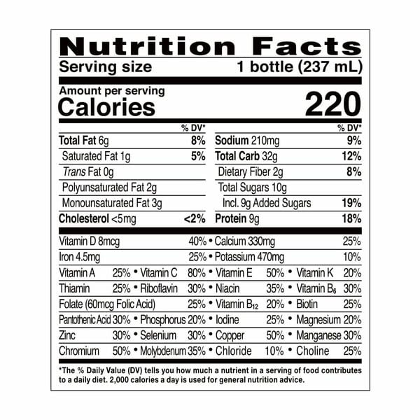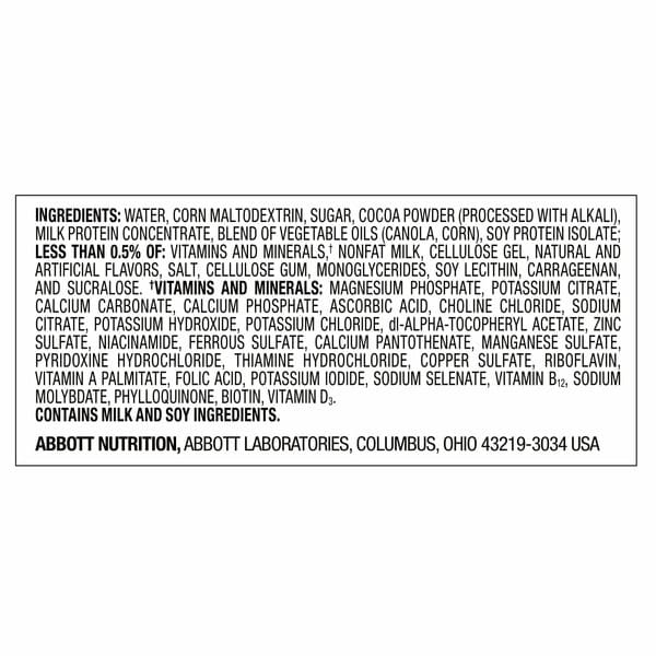 Water, Corn Maltodextrin, Sugar, Cocoa Powder (processed With Alkali), Milk Protein Concentrate, Blend Of Vegetable Oils (canola, Corn), Soy Protein Isolate, †vitamins And Minerals: Calcium Carbonate, Potassium Citrate, Magnesium Phosphate, Calcium Phosphate, Choline Chloride, Ascorbic Acid, Sodium Citrate, Dl-alpha-tocopheryl Acetate, Zinc Sulfate, Niacinamide, Ferrous Sulfate, Calcium Pantothenate, Manganese Sulfate, Potassium Chloride, Pyridoxine Hydrochloride, Thiamine Hydrochloride, Copper Sulfate, Riboflavin, Vitamin A Palmitate, Folic Acid, Potassium Iodide, Sodium Selenate, Sodium Molybdate, Vitamin B12, Phylloquinone, Biotin, Vitamin D3, Less Than 0.5% Of: Vitamins And Minerals,†Nonfat Milk, Cellulose Gel, Natural And Artificial Flavor, Salt, Cellulose Gum, Monoglycerides, Soy Lecithin, Carrageenan, Acesulfame Potassium, Sucralose, And Red 3