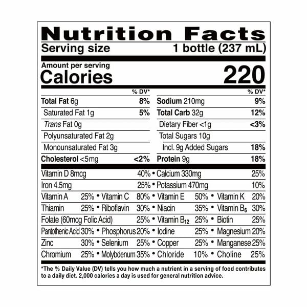 Water, Corn Maltodextrin, Sugar, Milk Protein Concentrate, Blend Of Vegetable Oils (canola, Corn), Soy Protein Isolate, Nonfat Milk, Less Than 0.5% Of: Vitamins And Minerals,† Natural And Artificial Flavor, Cellulose Gel, Salt, Cellulose Gum, Soy Lecithin, Monoglycerides, Carrageenan, Acesulfame Potassium And Sucralose, †vitamins And Minerals: Potassium Citrate, Magnesium Phosphate, Calcium Carbonate, Sodium Citrate, Calcium Phosphate, Choline Chloride, Ascorbic Acid, Potassium Chloride, Ferrous Sulfate, Dl-alpha-tocopheryl Acetate, Zinc Sulfate, Niacinamide, Calcium Pantothenate, Manganese Sulfate, Pyridoxine Hydrochloride, Thiamine Hydrochloride, Copper Sulfate, Riboflavin, Vitamin A Palmitate, Folic Acid, Chromium Chloride, Potassium Iodide, Sodium Selenate, Sodium Molybdate, Phylloquinone, Biotin, Vitamin D₃, Biotin, Vitamin B₁₂