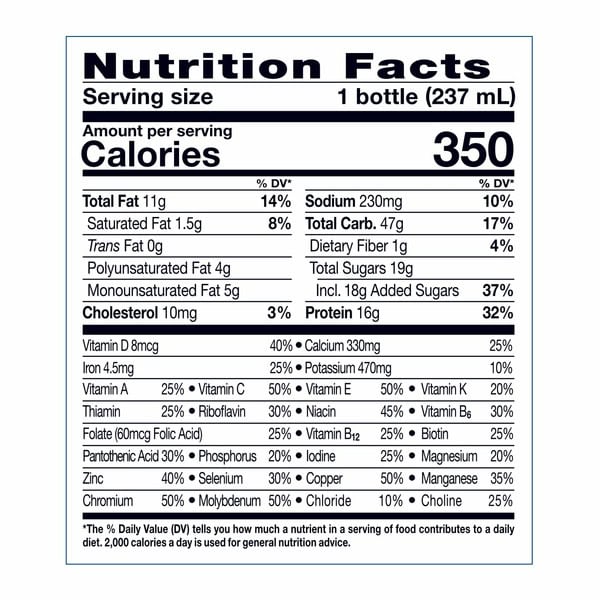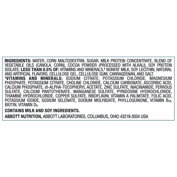 Water, Corn Maltodextrin, Sugar, Milk Protein Concentrate, Canola Oil, Cocoa Powder (processed With Alkali), Corn Oil, Soy Protein Isolate; Less Than 0.5% Of: Potassium Citrate, Magnesium Phosphate, Soy Lecithin, Sodium Citrate, Natural And Artificial Flavor, Potassium Chloride, Calcium Phosphate, Choline Chloride, Ascorbic Acid, Salt, Carrageenan, Potassium Hydroxide, Dl-alpha-tocopheryl Acetate, Zinc Sulfate, Niacinamide, Ferrous Sulfate, Calcium Pantothenate, Cupric Sulfate, Manganese Sulfate, Chromium Chloride, Fd&c Red #3, Vitamin A Palmitate, Thiamine Chloride Hydrochloride, Pyridoxine Hydrochloride, Riboflavin, Folic Acid, Biotin, Sodium Selenate, Potassium Iodide, Sodium Molybdate, Phylloquinone, Cyanocobalamin And Vitamin D3.