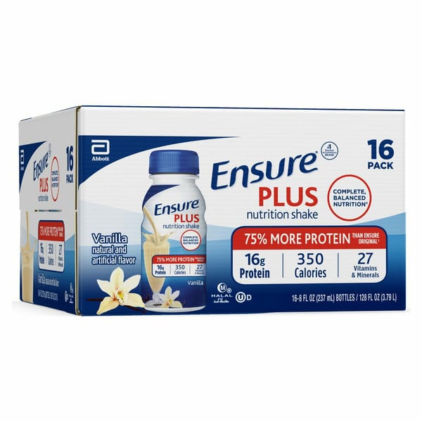† Ensure Plus = 16 g protein per 8 fl oz vs Ensure Original = 9 g protein per 8 fl oz.