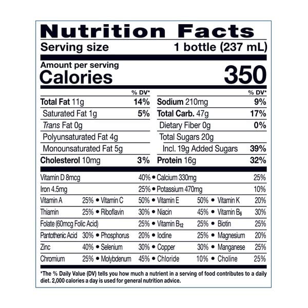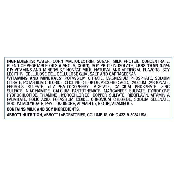 Water, Corn Maltodextrin, Sugar, Blend Of Vegetable Oils (canola, Corn), Milk Protein Concentrate, Soy Protein Isolate, Less Than 0.5% Of: Vitamins And Minerals,✝ Natural And Artificial Flavors, Nonfat Milk, Soy Lecithin, Cellulose Gel Cellulose Gum, Carrageenan, And Salt, ✝vitamins And Minerals: Potassium Citrate, Magnesium Phosphate, Sodium Citrate, Calcium Carbonate, Choline Chloride, Potassium Chloride, Ascorbic Acid, Ferrous Sulfate, Dl-alpha-tocopheryl Acetate, Zinc Sulfate, Niacinamide, Calcium Pantothenate, Manganese Sulfate, Calcium Phosphate, Pyridoxine Hydrochloride, Thiamine Hydrochloride, Copper Sulfate, Riboflavin, Vitamin A Palmitate, Folic Acid, Chromium Chloride, Potassium Iodide, Sodium Selenate, Sodium Molybdate, Phylloquinone, Biotin, Vitamin D2, And Vitamin B12